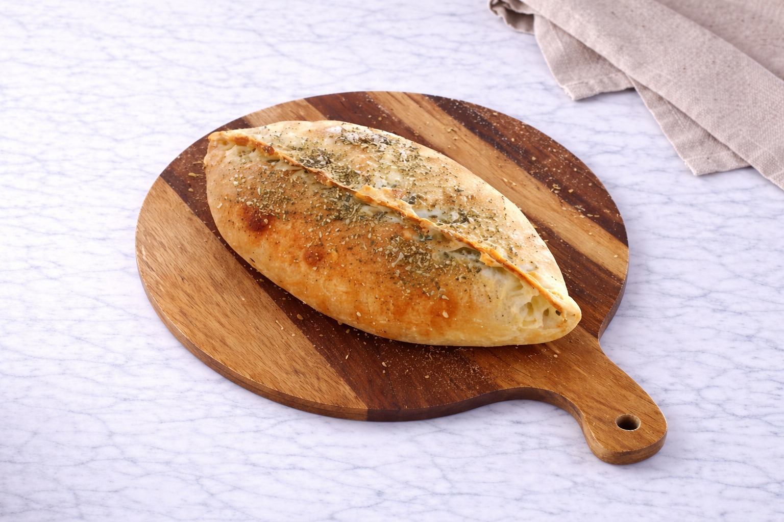 Tomatsås, ost, kokt skinka, champinjoner, räkor (dubbel inbakad)